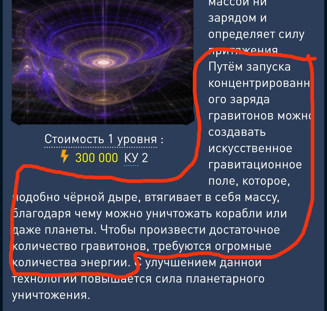 UncleanOne, Окей, тогда почему на разработку компонентов для фонарика (в игре гравипушки) используется только чистая энергия? Ведь гравитон - это, прежде всего, устройство, которое его создаёт. А устройство состоит из металла и других материалов. Значит если ,согласно твоей логике, гравитеха - это производство компонентов устройства, тогда энергии там нужно меньше, но нужны другие материалы, как например у аналога гравитехи у тоссов. Но если исходить из самого описания техи (вами же написанного) ,то гравитеха - это непосредственно создание гравитонов, гравилуча, на который нужно много энергии.))