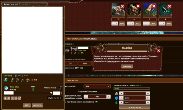 флот находится на координатах, с переработкой ресурсов. После сбора ресурсов, при попытке отправить флот на следующего пирата, выскочила ошибка (смотри скрин),