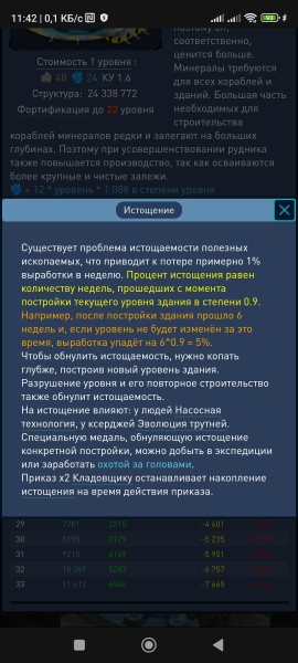 У меня есть Кладовщик 3ур, который уменьшает цифирь истощения на 6 единиц, следовательно, после постройки или апания уровня шахты, в моем случае конкретно, истощение не должно появляться ранее, чем через 9 недель (6-6=0 за 2 месяца). Но оно появляется уже через неделю, если не раньше - просто заметил поздно. И так на всех планках, где я недавно копал шахты.