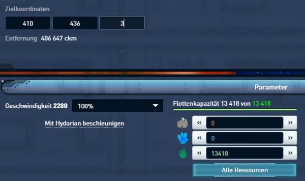 Danach scrollst noch ein wenig runter und gibst die Koordinaten deines Zielplaneten ein