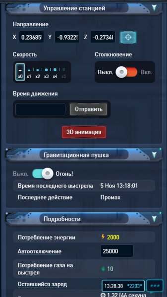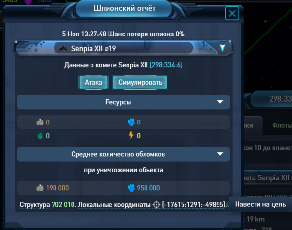 На указанных координатах крутится комета, с которой я уже добыл газ, и теперь хочу уничтожить её гравипушкой с ОПС на тех же координатах.