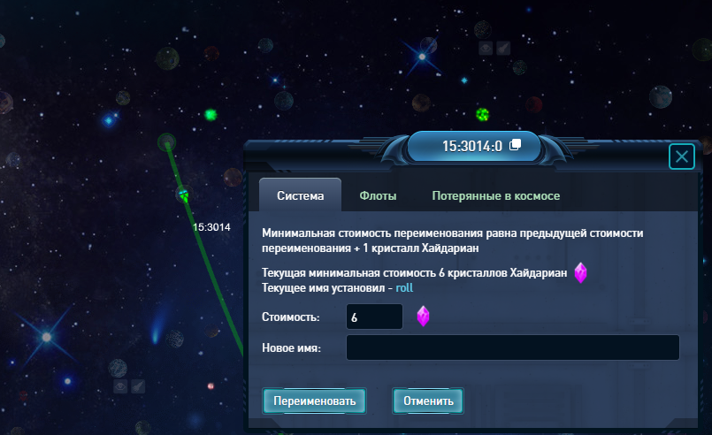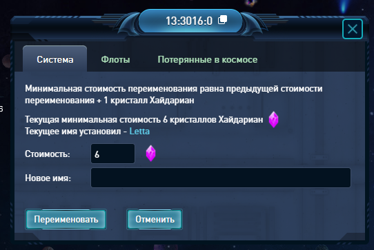 Зафиксировано, что я именовал систему. Судя по сумме, требуемой сейчас для переименования (6 ХД), никто больше её не переименовывал, но сейчас она называется стандартным названием, содержащим координаты.