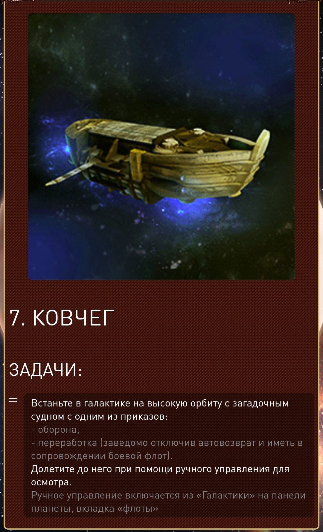 Здравствуйте, дошёл до мисии 7 жуков "Ковчег" и уткнулся в стену. Почему нет координат действующего прибывания ковчега? Куда лететь? Где он и что за миссия, где нет продолжающих её действий?
