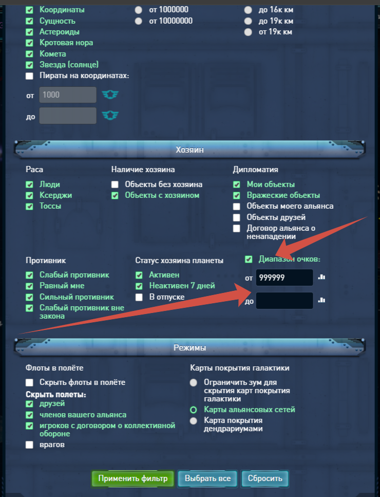 настроить остальные фильтры как угодно. посмотреть что отоборажатся объекты игроков в галактике. посавить любую фицру в фильтр от, и нажать галачку - игроки исченут даже те кто подходит по фильтру