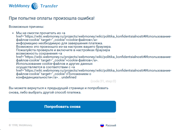 Описание:При редиректе на WebMoney после продолжительной паузы выдается ошибка/предупреждение.