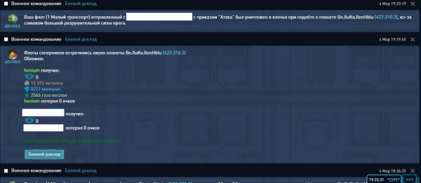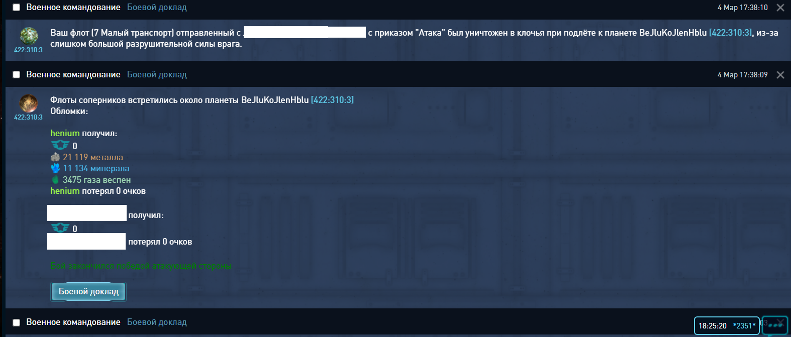 Ваш флот (11 Малый транспорт) отправленный с планеты XXXX с приказом "Атака" был уничтожен в клочья при подлёте к планете Colony XXXX, из-за слишком большой разрушительной силы врага.