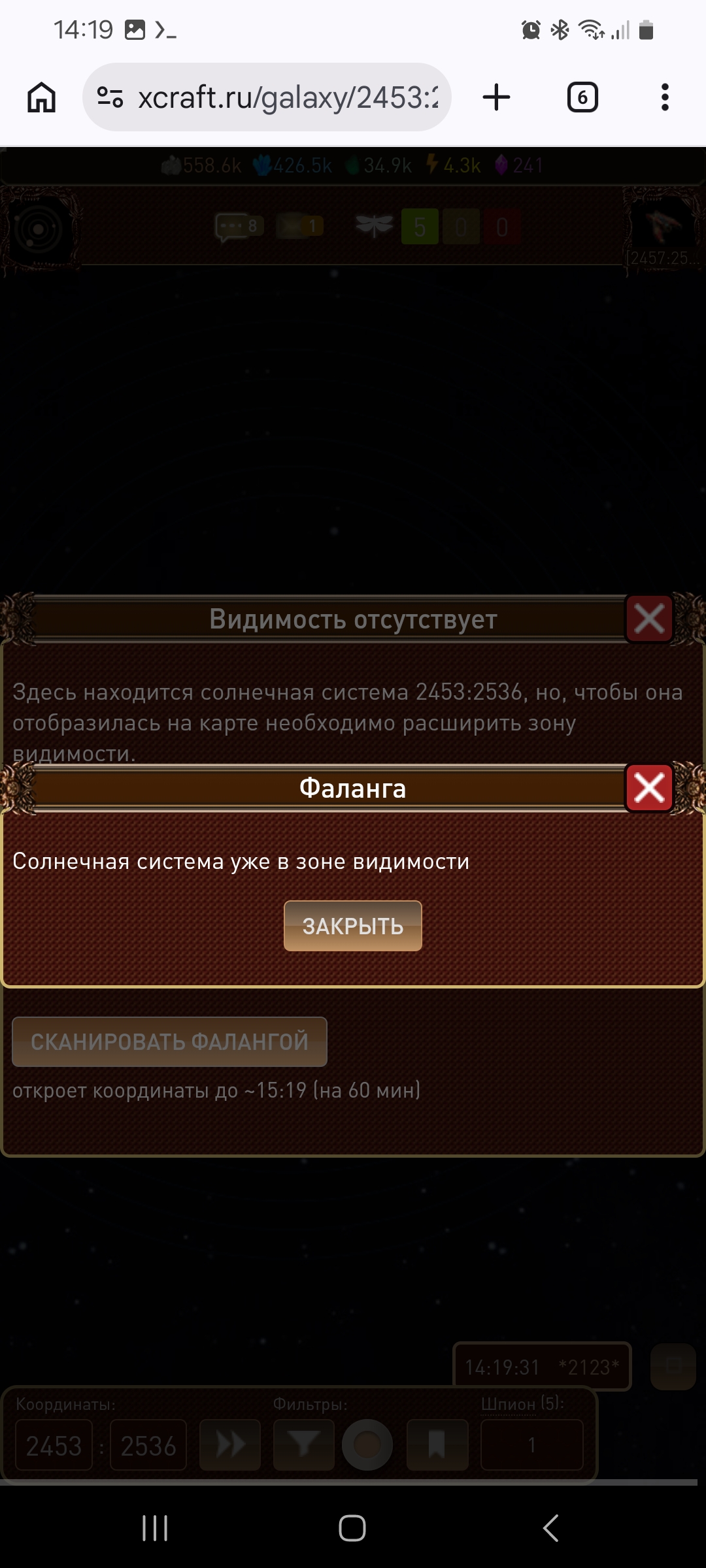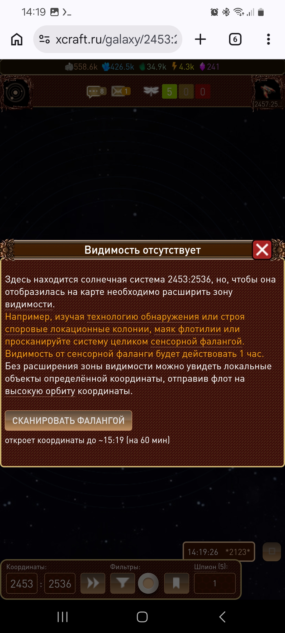 Видимость отсутствует даже своих планет и станций. Перезагрузкой страницы не фиксится. Игра говорит, что видимость системы отсутствует. При попытке сканирования игра говори, что видимость присутствует.