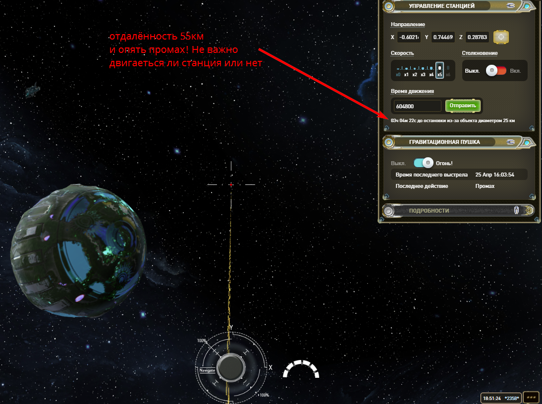 И вот опять! Опять промах! Облетела планету, навелась на цель и промах! Отдалённость 55км Вне зависимости двигается ли станция или нет. Притом на скрине видно что станция летит к цели.