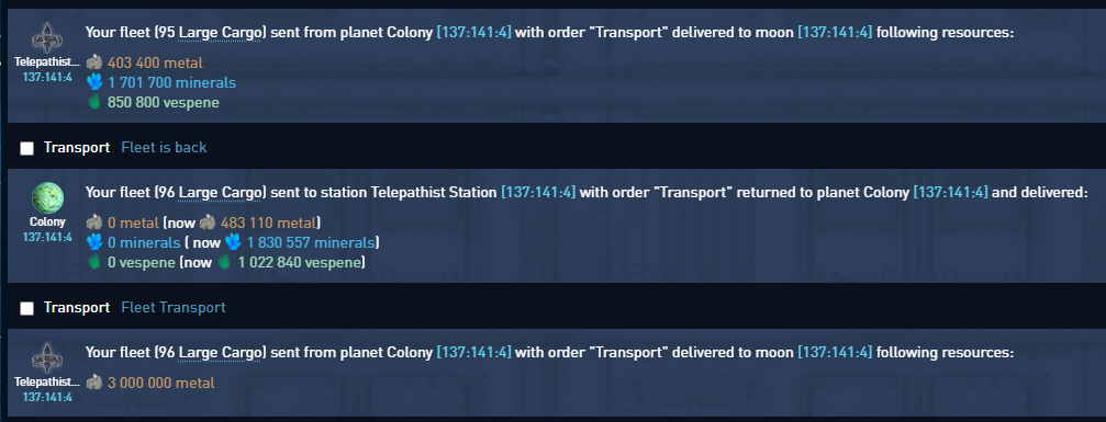 > sent the resources (did not have enough transporters and sent it in 2 batch