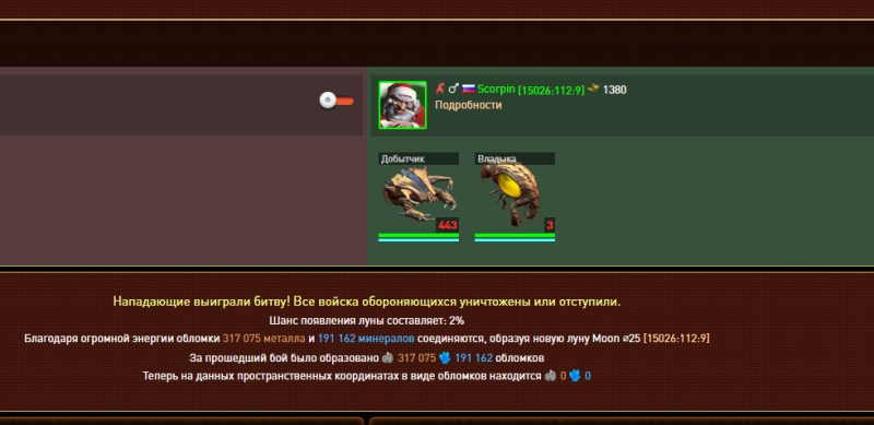 За прошедший бой было образовано 8 449 250 2 606 573 обломков + 79 Биомасса